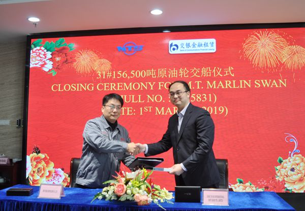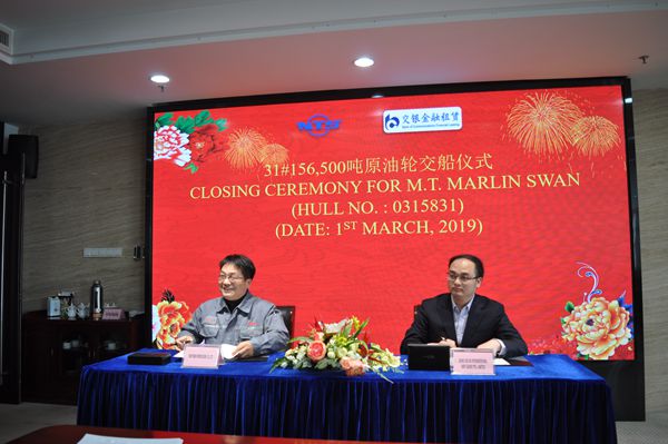 On March 1, 2019, the closing ceremony for No.31 156,500 DWT Crude Oil Tanker was held at the meeting room on 8th floor of New Times Office Building. Our CEO Mr. Liu Haijin, Executive General Manger Mr. Zhang Yuyong and the representative from the Owner attended this ceremony. The delivery documents for this ship were successfully signed by both parties.