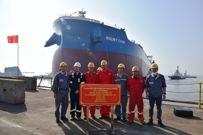 On June 9, 2023, the launching ceremony of one 210,000 DWT Bulk Carrier bearing builder's hull no.0120847 has been carried out successfully by New Times Shipbuilding Co., Ltd. Our Chairman Mr. Yuan Kaifei, Vice Chairman Mr. Zhu Bingkang, CEO Mr. Liu Haijin, Executive Deputy General Manager Mr. Zhang Yuyong, the representatives from EPS Site Office and ABS classification society attended and witnessed the ceremony together.