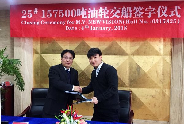 On January 4, 2018, the closing ceremony for No.25 157,500 DWT Crude Oil Tanker was held at the meeting room on 8th floor of New Times Office Building. Our Executive General Manger Mr. Zhang Yuyong and representatives from Owner Dong-A Tanker attended this ceremony. The delivery documents for this ship were successfully signed by both parties.