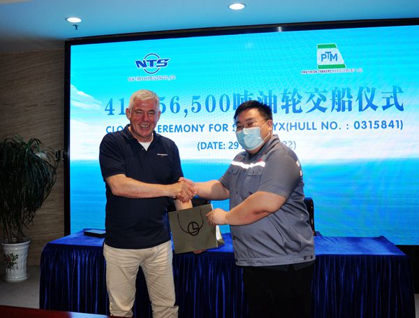 On June 29, 2022, the closing ceremony was held at the meeting room on 8th floor of New Times Office Building for one unit of 156,500 DWT Crude Oil Tanker with Builder's Hull No.0315841 that was built for Pantheon Tankers. Our Executive Deputy General Manager Mr. Zhang Yuyong, Deputy General Manager & Executive Director Mr. Yuan Heng and the Owner's Representative Mr. Chachamopoulos Ioannis attended this ceremony. The vessel was smoothly and successfully delivered by us and accepted by the Owner.