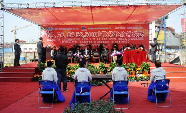 On Nov. 2nd, the naming ceremony of No.6,7&8 58,500 DWT Bulk Carriers was held ceremoniously in our shipyard. Executive Vice President Mr. Zhang Yuyong conducted this ceremony, CEO Mr. Liu Haijin, Vice General Manager Mr. Zhu Hangang, General Manager Assistant Mr. Xu Zhenyu & Mr. Zhengzhong and representatives from the Class and Shipowner attended this ceremony.