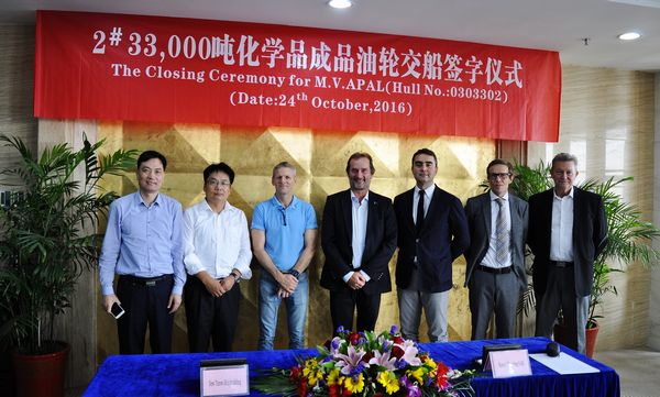 On Oct. 24th, 2016, the delivery ceremony for No.2 33,000 DWT Product Oil and Chemical Tanker was held at the meeting room on 8th floor of New Times Office Building. The delivery documents for this ship were successfully signed by Executive Deputy General Manger Mr. Zhang Yuyong and representatives from the Contracted Buyer, Jo Invest AS.