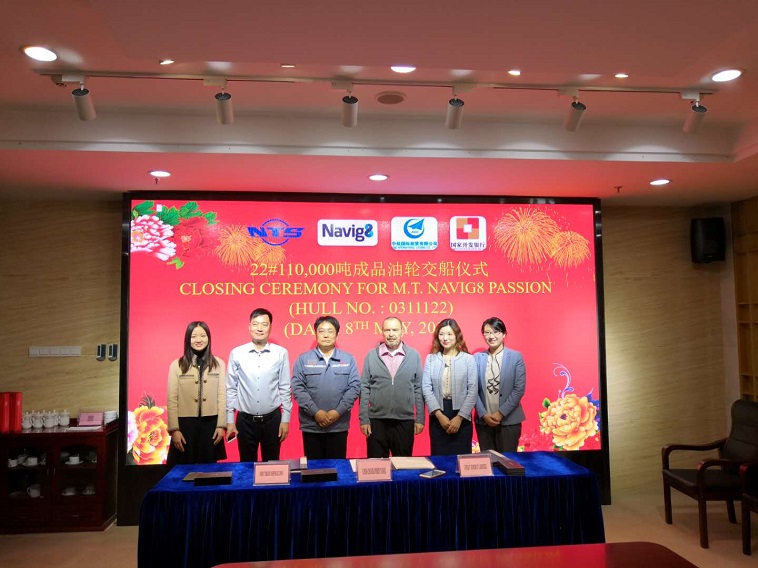 On May 8, 2019, the closing ceremony for 22# 110,000 DWT Product Oil Tanker was held at the meeting room on 8th floor of New Times Office Building. Our Executive General Manger Mr. Zhang Yuyong and the representatives from AVIC, Navig8 and China Development Bank attended this ceremony. The vessel was smoothly and successfully delivered by us and accepted by the Buyer.