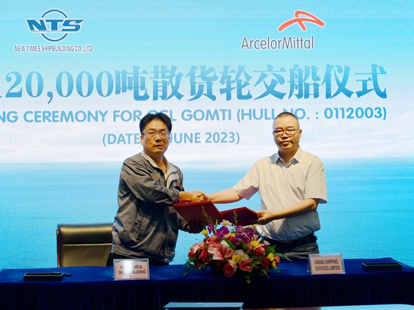On June 30, 2023, the closing ceremony for 3# 120,000 DWT Bulk Carrier with Hull No.0112003 was held at the meeting room on 8th floor of New Times Office Building. Our Executive Deputy General Manager Mr. Zhang Yuyong and the owner's representative were present. The vessel was smoothly and successfully delivered by us and accepted by the Owner.