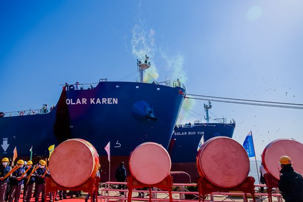 On November 9 and November 10, 2021, the closing ceremony for 26# and 27# 50,000 DWT Product Oil/Chemical Tanker (IMO II Type) was held respectively at the meeting room on 8th floor of New Times Office Building. Our CEO Mr.Liu Haijin, Executive Deputy General Manager Mr. Zhang Yuyong, Deputy General Manager Mr. Yuan Heng, Vice General Manager Mr. Xu Tao of Shandong Shipping Corporation and the representive from ICBC Financial Leasing Co., Ltd. attended this ceremony. The vessels were smoothly and successfully delivered by us and accepted by the Owner. On November 10, Godmother Mrs. He Li named the vessel bearing Hull No.0405026 for "Ruo Yun", Godmother Mrs. Xu Li named the vessel bearing Hull No.0405027 for "Karen".