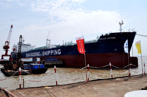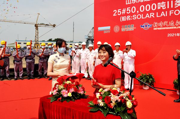 On August 23, 2021, e-closing for 25# 50,000 DWT Product Oil/Chemical Tanker (IMO II Type) was held at the meeting room on 8th floor of New Times Office Building. Our CEO Mr. Liu Haijin and Deputy General Manager & Executive Director Mr. Yuan Heng were present. Mr. Zhang Yuyong Executive Deputy General Manager of New Times Shipbuilding Co., Ltd.,  Mr. Xu Tao Vice General Manager of Shandong Shipping Corporation signed the delivery documents via video and email. The vessel was smoothly and successfully delivered by us and accepted by the Owner. On the same day, Godmother Mrs. Chen Wenlei named the vessel for "SOLAR LAI FONG".