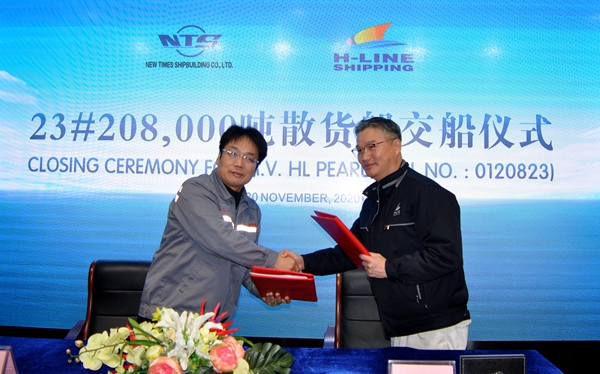 On November 30, 2020, the closing ceremony for 23# 208,000 DWT Bulk Carrier was held at the meeting room on 8th floor of New Times Office Building. Our CEO Mr.Liu Haijin, Executive General Manger Mr. Zhang Yuyong and the representive from H-Line Shipping Co., Ltd. attended this ceremony. The vessel was smoothly and successfully delivered by us and accepted by H-Line.