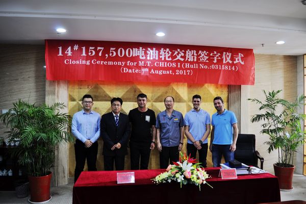On August 7, the closing ceremony for No.14 157,500 DWT Crude Oil Tanker was held at the meeting room on 8th floor of New Times Office Building. Our CEO Mr. Liu Haijin, Executive General Manger Mr. Zhang Yuyong and representatives from Owner Dynacom attended this ceremony. The delivery documents for this ship were successfully signed by both parties.