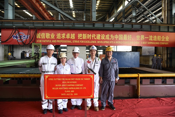 On July 24, 2020 , the Steel Cutting Ceremony of two units of 156,500 DWT Crude Oil Tankers with Hull Nos.0315835 and 0315836 has been carried out successfully by New Times Shipbuilding Co., Ltd. Production Manager Mr.Chen Yuefeng from New Times Shipyard, Mr.Davor Radic and Mr.Sun Yachun as representatives of Metrostar and Mr.Lu Jieyu from ABS Class attended and witnessed the ceremony together.