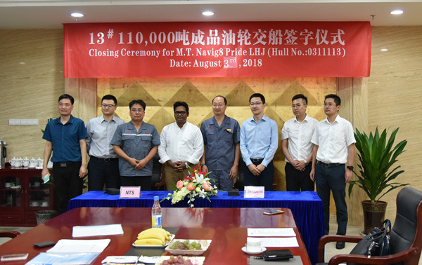 On August 3, 2018, the closing ceremony for No.13 111,000 DWT Oil Tanker was held at the meeting room on 8th floor of New Times Office Building. Our CEO Mr. Liu Haijin, Executive General Manger Mr. Zhang Yuyong and the representatives from the Owner attended this ceremony. The delivery documents for this ship were successfully signed by both parties.