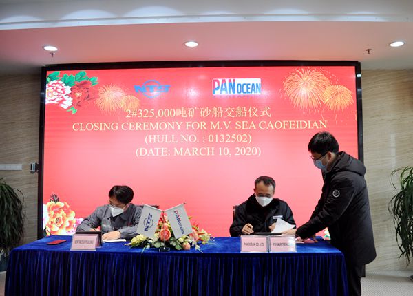 On March 10, 2020, the closing ceremony for 2# 325,000 DWT ORE CARRIER was held at the meeting room on 8th floor of New Times Office Building. Our Executive General Manger Mr. Zhang Yuyong and the representative from Pan Ocean Co., Ltd. Mr. Nak Jin Choi attended this ceremony. The vessel was smoothly and successfully delivered by us and accepted by the Buyer.