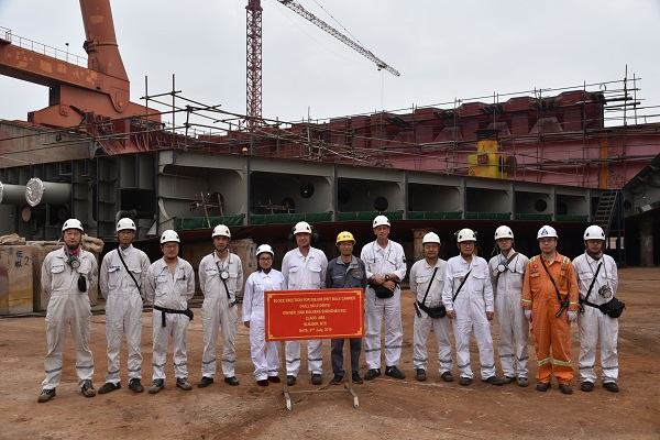 On July 3, 2019, the block erection ceremony of No.15 208,000 DWT Bulk Carrier was held in Drydock No.3. Our General Manager Assistant Mr. Ding Baiying and representatives from the owner 2020 Bulkers and ABS classification society attended this event.