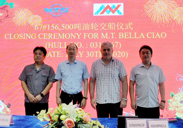 On July 30, 2020, the closing ceremony for 67# 156,500 DWT Crude Oil Tanker was held at the meeting room on 8th floor of New Times Office Building. Our CEO Mr.Liu Haijin, Executive General Manger Mr. Zhang Yuyong, the representive from NGM Mr. Nikitas, attended this ceremony. God mother Mrs. Yan Ling named the vessel 0315867 for "BELLA CIAO". The vessel was smoothly and successfully delivered by us and accepted by NGM.