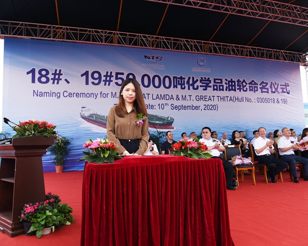 On September 10, 2020, we held naming ceremony for two units of 50,000 DWT Product Oil/ Chemical Tankers with Hull Nos.0305018/19 those were built for AVIC and charterered to Navig8. Our CEO Mr.Liu Haijin, Board Director Mr. Yuan Heng, Executive General Manger Mr. Zhang Yuyong, Deputy general manager Mr. Zhu Hangang, Assistant General Manager Mr. Xu Zhenyu, and guests from AVIC: God mothers Miss Gu Liangyu and Ms.Zhou Wenjing, Vice President Mr. Li Jun, Deputy Manager of Shipping Division Mr.Yang Guangyi , Navig8 Chief Representative Mr. Gordon Shen and its site team manager Mr.Binod Kumar and KR General Manager of KR Shanghai Branch Mr.Park Joonhyun etc., were present at this ceremony.