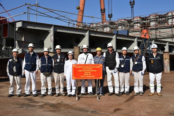 On November 15, 2019, the block erection ceremony of No.18 208,000 DWT Bulk Carrier was held in Drydock No.3. Our General Manager Assistant Mr. Ding Baiying and representatives from the owner 2020 Bulkers and ABS classification society attended this event.