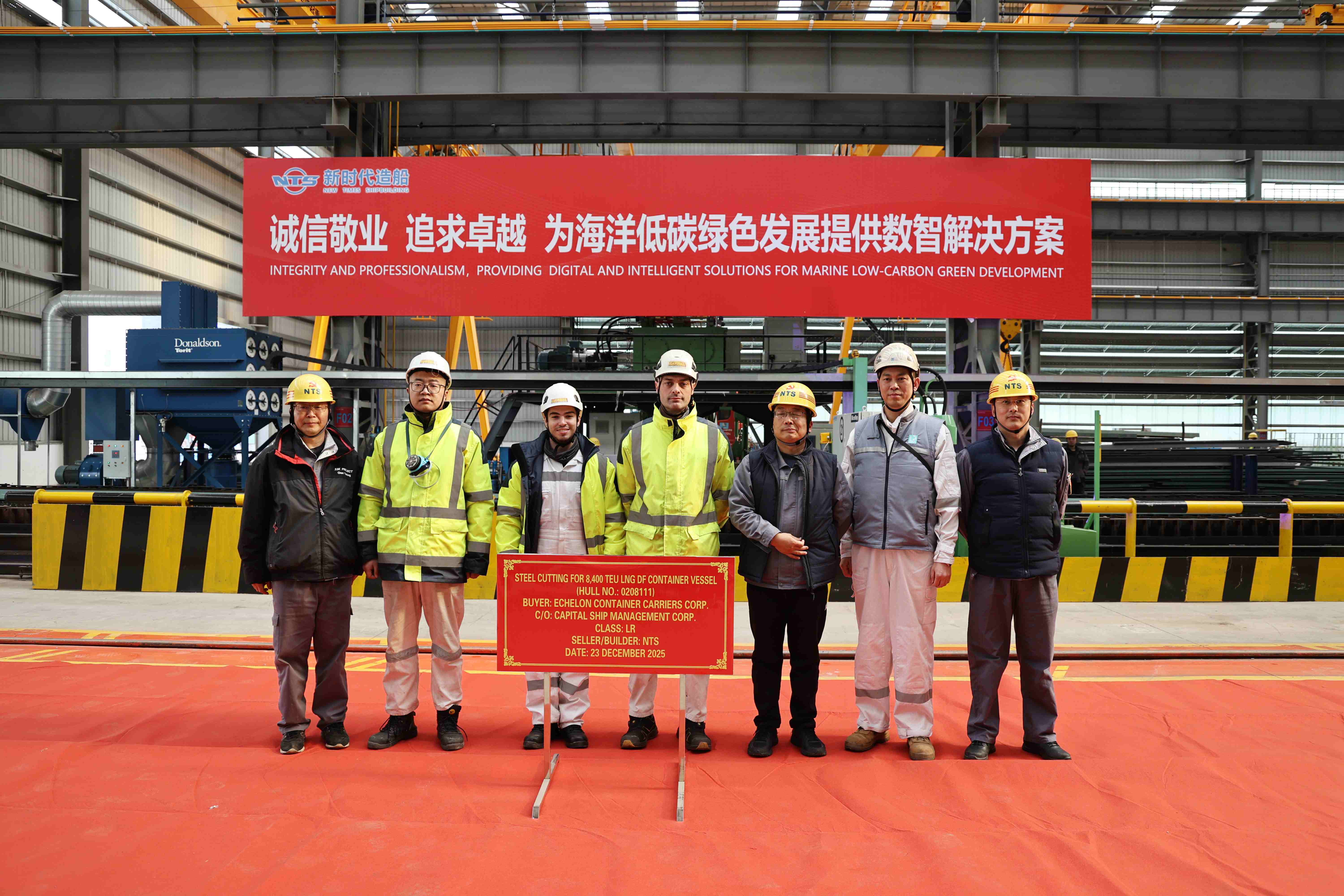 On December 23, 2025, the steel cutting of one 8400 TEU LNG Dual Fuel Container Vessel bearing builder's hull no.0208111 was carried out successfully by New Times Shipbuilding Co., Ltd.. The representatives from shipyard, Capital Site Team and LR classification society attended and witnessed this event.