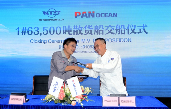 On September 21, 2020, the closing ceremony for 1# 63,500 DWT Bulk Carrier was held at the meeting room on 8th floor of New Times Office Building. Our CEO Mr.Liu Haijin, Executive General Manger Mr. Zhang Yuyong and the representive Mr. Nak Jin Choi from Pan Ocean Co., Ltd. attended this ceremony. The vessel was smoothly and successfully delivered by us and accepted by Pan Ocean.