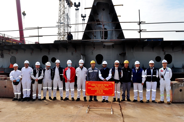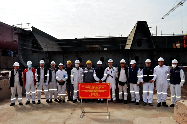 On April 6, 2021, the keel laying ceremony of two units of 50,000 DWT Product Oil/Chemical IMO Type 2&3  Tankers with Hull Nos.0405004 and 0405005 has been carried out successfully by New Times Shipbuilding Co., Ltd. Our Deputy General Manger Mr. Zhu Hangang, General Manager Assistant Mr. Xu Zhenyu and representatives from the owner BIHAR INTERNATIONAL COMPANY and ABS Class attended and witnessed the ceremony together.