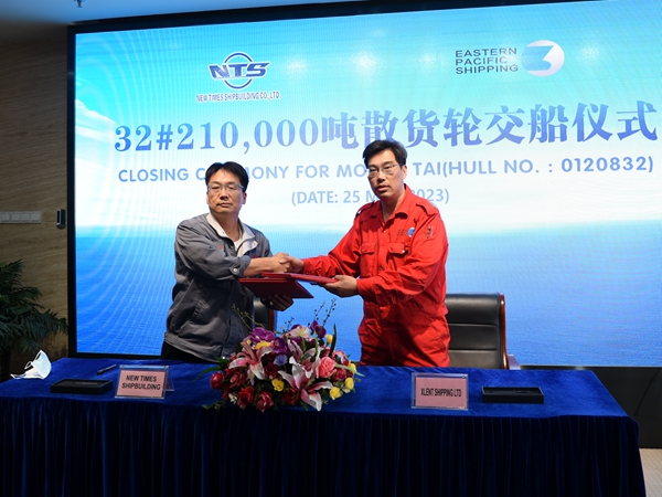 On May 25, 2023, the closing ceremony for 32# 210,000 DWT Bulk Carrier with Hull No.0120832 was held at the meeting room on 8th floor of New Times Office Building. Our CEO Mr. Liu Haijin, Executive Deputy General Manager Mr. Zhang Yuyong, Deputy General Manager & Executive Director Mr. Yuan Heng and owner's representative were present. The vessel was smoothly and successfully delivered by us and accepted by the Owner.
