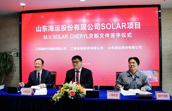 On April 30, 2021, the closing ceremony for 21# 50,000 DWT Product Oil/Chemical Tanker (IMO II Type) was held at the meeting room on 8th floor of New Times Office Building. Our CEO Mr. Liu Haijin, Executive Deputy General Manger Mr. Zhang Yuyong and Vice General Manager Mr. Xu Tao of Shandong Shipping Corporation attended this ceremony. The vessel was smoothly and successfully delivered by us and accepted by the Owner.