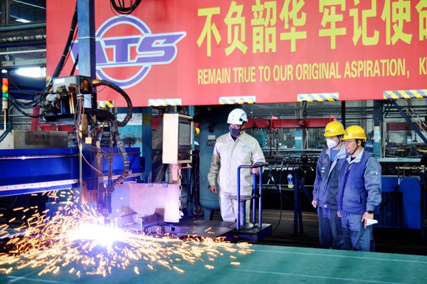 上午8:58,挪威船東Frontline公司現(xiàn)場經(jīng)理Raman按下等離子切割機按鈕,40#115000噸油船率先點火開工,該船總長249.9米,型寬44米,型深21.5米,設計吃水13.6米,結(jié)構(gòu)吃水15.2米,載重115000噸,入LR船級社。挪威船東Frontline公司共訂制2艘115000噸油船,首制船己于1月18日開工建造。