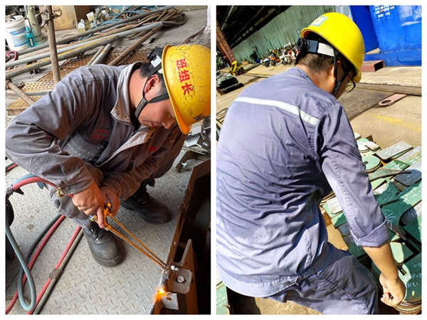 看現(xiàn)場:搭載測控員顧陳駿,為確保分段(總段)定位精度,總段無余量搭載的順利進(jìn)行,不顧天氣炎熱,每天爬上爬下10多個總段,汗流夾背地奮戰(zhàn)在驕陽似火的工作現(xiàn)場;鋼加車間集配員顧學(xué)飛,工作兢兢業(yè)業(yè),每天外場頂著日烈,核對材料準(zhǔn)確后再配送至各車間;鋼加新區(qū)下料四組火焰機(jī)操作工侯棟,在火焰中堅守崗位;機(jī)裝部裝配工周劍偉身著長袖工作服、厚重的勞保鞋“全副武裝”,默默堅守在各自的崗位上,用熱情和汗水詮釋著責(zé)任與擔(dān)當(dāng);不懼艙室內(nèi)的悶熱的20833#油漆女工正在分段艙內(nèi)進(jìn)行油漆修補(bǔ)……他們只是成千上萬個造船人的縮影,揮灑汗水的身影隨處可見。