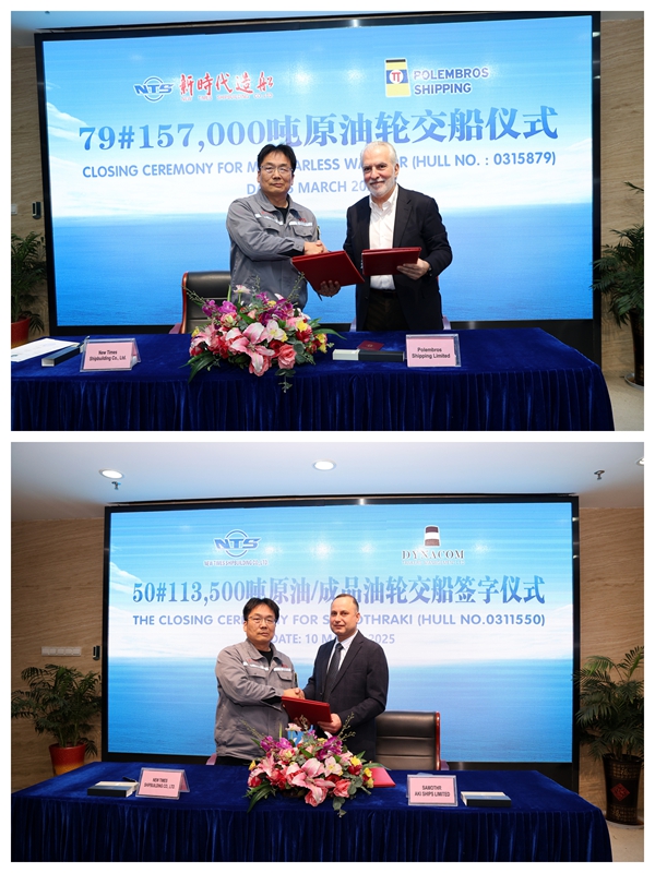 3月5日、10日,公司分別與希臘船東Polembros公司、希臘船東Dynacom公司簽署交船文本,79#157000噸油船、50#113500噸油船相繼交付船東運(yùn)營(yíng),80#157000噸油船也將于近期交付。