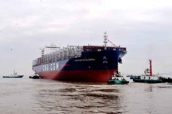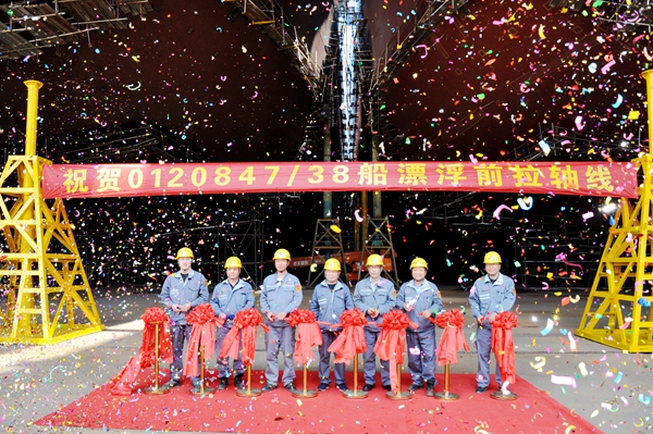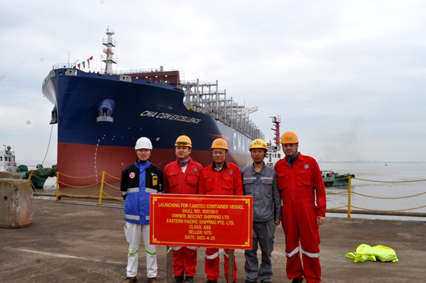 4月25日上午,新區(qū)3#塢內(nèi),新建1#7000箱集裝箱船、37#210000噸LNG雙燃料動(dòng)力散貨船在海事拖輪的牽引下相繼駛出船塢,?恐链棒秆b碼頭,兩船下水大節(jié)點(diǎn)按期實(shí)現(xiàn)。