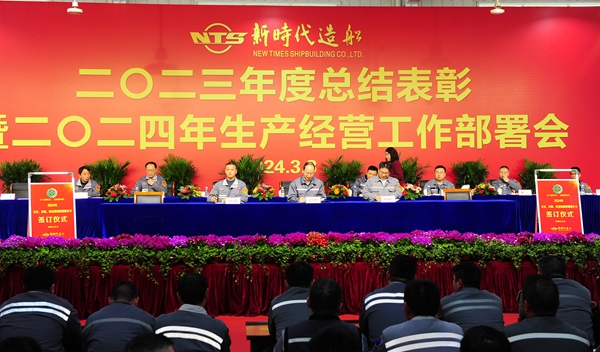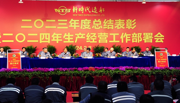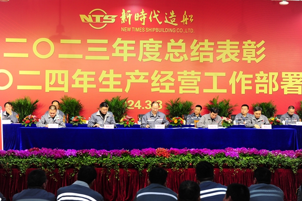 常務副總經理張玉永主持大會,他指出,2023年,我們在公司董事會、黨委和經營層的正確領導下,強管理,促生產,交出了一份含金量滿滿的答卷。今天我們新時代造船人隆重舉行“二〇二三年度總結表彰暨二〇二四年生產經營工作部署會”,主要目的是總結2023年工作,表彰先進典型;部署2024年任務,動員公司上下樹立榜樣力量,以嶄新的姿態(tài)、飽滿的熱情、務實的作風,接續(xù)奮斗、奮勇前行,全面提升公司各項管理工作,奮力譜寫新時代高質量發(fā)展新篇章,把新時代造船打造成世界一流的百年造船企業(yè)。