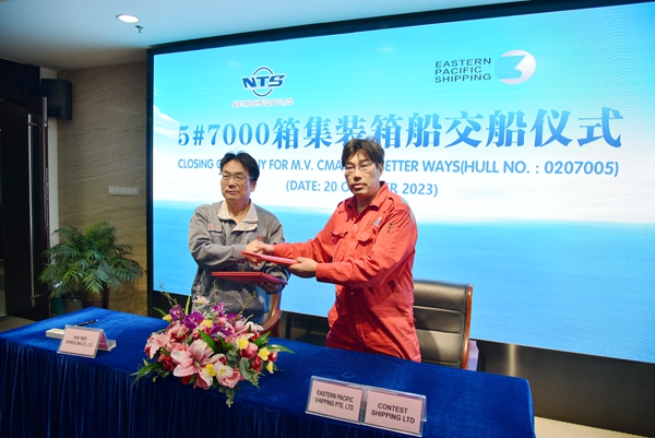10月20日上午,公司在八樓會(huì)議室舉行船舶簽字交付儀式,常務(wù)副總經(jīng)理張玉永、副總經(jīng)理袁衡與船東EPS公司代表倪杰出席活動(dòng)。張玉永與倪杰代表雙方在交船文本上簽字,5#7000箱集裝箱船正式交付船東運(yùn)營。