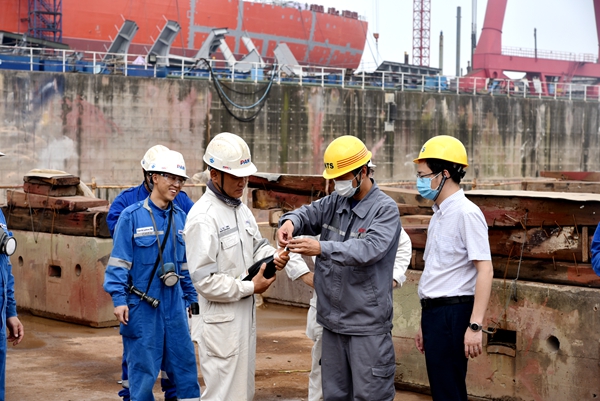 6月25日,3#63500噸散貨船上臺合攏龍儀式在西區(qū)1#塢舉行,公司總經(jīng)理助理徐震宇與韓國船東PanOcean公司代表共同出席儀式。63500噸散貨船船長199.9米,船寬32.26 米,船深18.9米,結(jié)構(gòu)吃水13.5米,載重噸63,500MT。