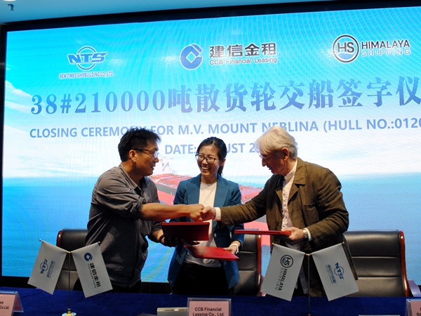 在大家的共同見證下,常務(wù)副總經(jīng)理張玉永與船東現(xiàn)場(chǎng)經(jīng)理Davor Radic、建信金租船舶業(yè)務(wù)部銷售總監(jiān)鈕文玨共同簽署交付文本。船東Himalaya(喜馬拉雅)公司目前在我們企業(yè)訂有12艘210000噸雙燃料動(dòng)力散貨船,此次交付的是210000噸雙燃料動(dòng)力散貨船系列中的第六艘船舶。