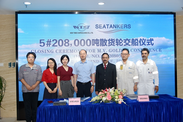 6月22日上午,公司在辦公樓八樓會(huì)議室舉行5#208000噸散貨船交船簽字儀式,總經(jīng)理劉海金、常務(wù)副總經(jīng)理張玉永和船東SEATANKERS公司代表A.C.Caeiro先生等嘉賓一起出席活動(dòng)。儀式上,常務(wù)副總經(jīng)理張玉永與船東SEATANKERS公司代表A.C.Caeiro先生共同簽署交船文本,5#208000噸散貨船正式交付船東。
