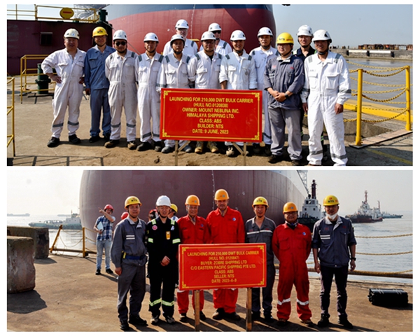 董事長袁凱飛、副董事長朱炳康、總經(jīng)理劉海金等領(lǐng)導(dǎo)與船東喜馬拉雅公司代表、船東Eastern Pacific Shipping Pte. Ltd.(EPS)公司代表一起在現(xiàn)場觀看船舶下水。