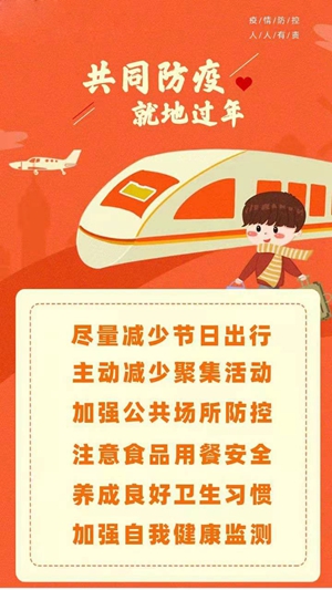 前不久,國務(wù)院應(yīng)對新型冠狀病毒感染肺炎疫情聯(lián)防聯(lián)控機(jī)制綜合組發(fā)布了《關(guān)于做好2021年元旦和春節(jié)期間新冠肺炎疫情防控工作的通知》,要求在嚴(yán)格“做好個人防護(hù)、科學(xué)佩戴口罩、養(yǎng)成衛(wèi)生習(xí)慣、減少人員聚集、保持社交距離”等防控措施的同時,鼓勵員工就地過年,減少人員流動,減少路途風(fēng)險。省市各級黨委政府也已發(fā)出號召,靖江市衛(wèi)健委也發(fā)出了“關(guān)于進(jìn)一步加強(qiáng)春節(jié)期間疫情防控工作的通告”,倡導(dǎo)非必要不出靖,省外務(wù)工人員留靖過節(jié)。