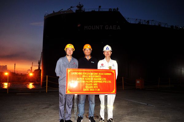 7月30日清晨,新區(qū)3#塢內(nèi)新建27#210000噸散貨船、34#156500噸油船相繼在海事拖輪的牽引下駛出船塢,?恐链棒秆b碼頭,兩船下水大節(jié)點(diǎn)按期實(shí)現(xiàn)?偨(jīng)理劉海金分別與船東新加坡Eastern Pacific Shipping Pte. Ltd.(EPS)、船東新加坡Singfar國(guó)際公司代表在現(xiàn)場(chǎng)見證船舶下水全過(guò)程。