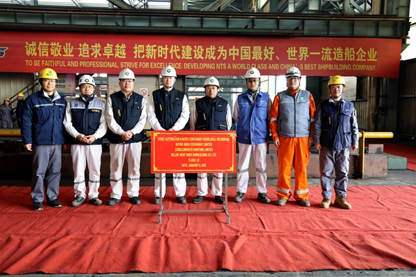 1月6日上午,5#6#8100箱雙燃料動力集裝箱船開工點火儀式在新區(qū)鋼加車間舉行,生產(chǎn)管理部、質(zhì)量部、營銷部等部門負(fù)責(zé)人與船東CONGLOMERATE MARITIME LIMITED代表一起出席活動,見證兩艘船舶船體結(jié)構(gòu)件開始預(yù)制。