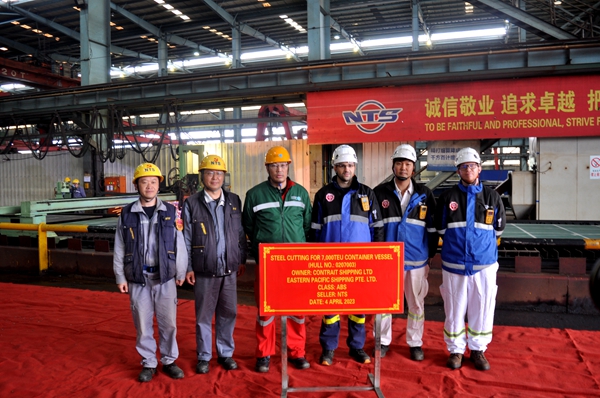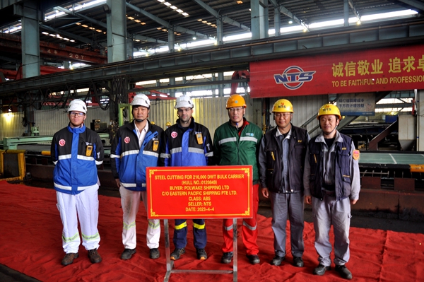 船東Eastern Pacific Shipping Pte. Ltd.(EPS)代表倪杰、生產(chǎn)管理部部長陳月鋒、質(zhì)量管理部代表、營銷部代表等相關(guān)人員出席活動,見證船舶開工建造。