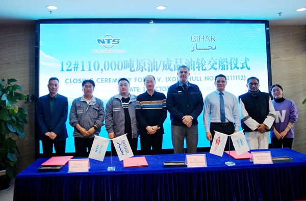 10月13日下午3:00,公司在辦公樓八樓會(huì)議室舉行船舶簽字交付儀式,常務(wù)副總經(jīng)理張玉永與沙特船東BIHAR INTERNATIONAL COMPANY代表共同簽署交船文本,12#110000噸油船交付船東運(yùn)營(yíng),這是今年交付的第17艘船舶?偨(jīng)理劉海金、副總經(jīng)理袁衡出席簽字儀式。