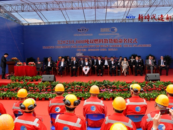 5月4日上午,32#210000噸雙燃料動(dòng)力散貨船命名儀式在公司3#碼頭隆重舉行。董事長袁凱飛、總經(jīng)理劉海金、常務(wù)副總經(jīng)理張玉永、副總經(jīng)理袁衡、總經(jīng)理助理徐震宇與船東EPS(Eastern Pacific Shipping Pte. Ltd.)董事長Idan Ofer、教母Wong Liang Pin等嘉賓出席儀式。