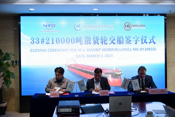 3月2日下午,公司在八樓會議室舉行船舶簽字交付儀式,33#210000噸雙燃料動力散貨船交付船東Himalaya公司運(yùn)營。