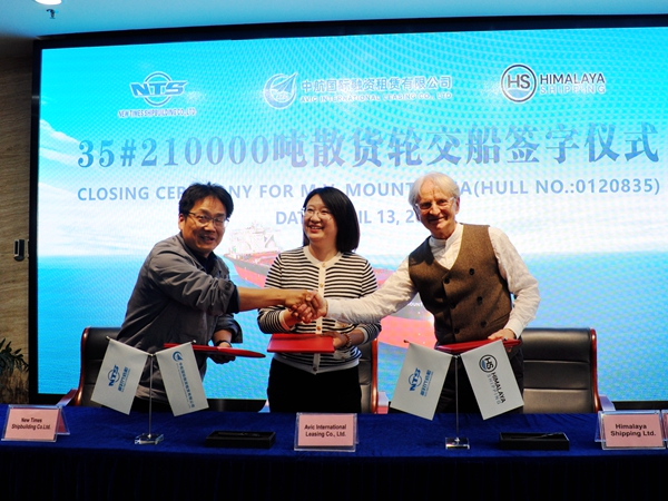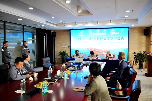 4月13日下午,公司在八樓會議室舉行船舶簽字交付儀式,35#210000噸雙燃料動力散貨船交付船東Himalaya公司運營。