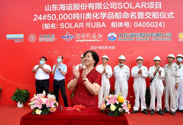 在辦公樓八樓會議室,常務副總經理張玉永與山東海運副總經理徐濤及工銀租賃代表通過“云交付”方式,一起簽署了交船文本;簽字結束后,總經理劉海金、教母黃銀芳女士等嘉賓一起來到西區(qū)舾裝碼頭,參加船舶命名儀式。教母黃銀芳女士將24#50000噸化學品油船命名為“SOLAR RUBA”號,并祝愿她在未來的航程中乘風破浪,航行順利;順達貨滿,船員平安啟歸。儀式結束后,總經理劉海金又與參加活動的嘉賓們一起參觀了新船。
