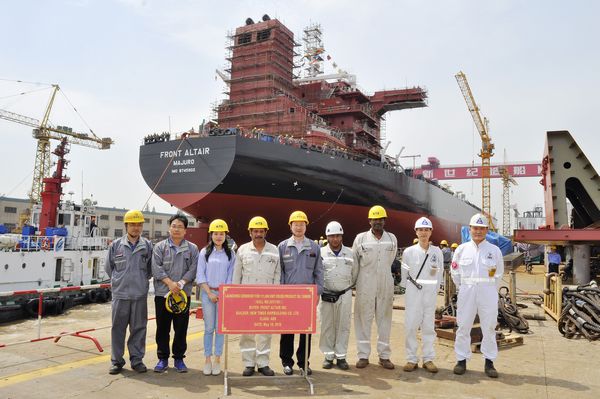 (Pictured here is CEO Mr. Liu Haijin, Executive Vice President Mr. Zhang Yuyong, Vice General Manager Mr. Zhu Hangang, representatives from owner Frontline and class ABS attending the launching ceremony of No.1 111,000 DWT Crude Oil Tanker)