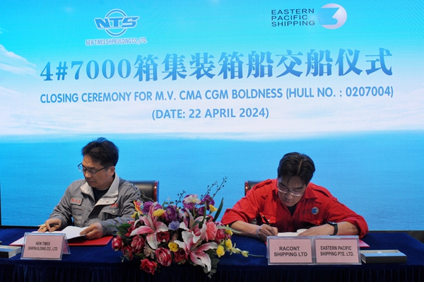 On April 22, 2024, the closing ceremony for 4# 7000 TEU Container Vessel with Builder's Hull No.0207004 was held at the meeting room on 8th floor of New Times Office Building. Our CEO Mr. Liu Haijin, Executive Deputy General Manager Mr. Zhang Yuyong and owner's representative were present. The vessel was smoothly and successfully delivered by us and accepted by the Owner.