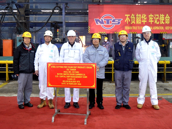 On February 29, 2024, the steel cutting of one 115,000 DWT Crude/Product Oil Tanker bearing builder's hull no.0311545 has been carried out successfully by New Times Shipbuilding Co., Ltd. The representatives from Capital Site Office, LR classification society and shipyard attended and witnessed the ceremony together.