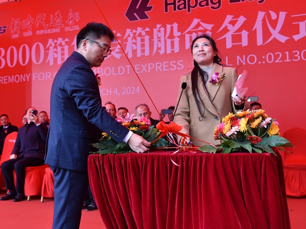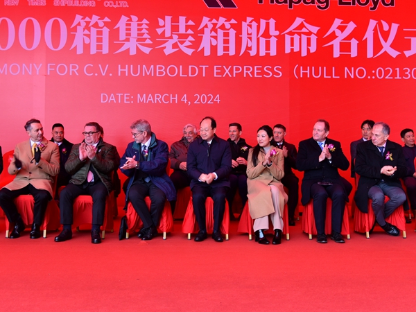 On March 4, 2024, we held naming ceremony for one 13000 TEU Container Vessel with Builder's Hull No.0213003. Our CEO Mr. Liu Haijin, Executive Deputy General Manager Mr. Zhang Yuyong, Hapag-Lloyd Hamburg - Managing Director Fleet Mr. Richard von Berlepsch, Hapag-Lloyd Hamburg - Senior Director Mr. Lutz-Michael Dyck, Anglo-Eastern Univan Group - CEO Mr. Bjorn Hojgaard, Anglo Eastern Technical Services Ltd. - MD Mr. Arunava Sengupta, Chartworld Shipping Corporation - New Building Manager Mr. Spyros Papandreou, BV Senior Vice President, Chief Executive; Marine & Offshore North Asia and China Mr. Alex Gregg-Smith, BV New Construction Dept. Manager in China - Mr. Christophe Vaes and other VIP guests attended this ceremony. Godmother Mrs. Brenda Hojgaard named the vessel for "HUMBOLDT EXPRESS".