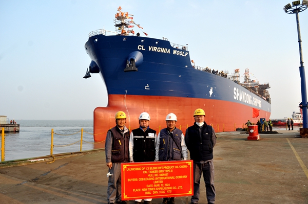 On March 12, 2024, the launching of one 50,000 DWT Product Oil/Chemical Tanker (IMO Type 2) with Hull No.0405037 has been carried out successfully by New Times Shipbuilding Co., Ltd. The representatives from the owner CDB Leasing (International) Co., Ltd. and the representatives from the classification societies DNV and CCS attended and witnessed the ceremony together.