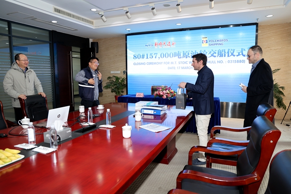 On March 17, 2025, the closing ceremony for 80# 157,000 DWT Crude Oil Tanker bearing builder's hull no.0315880 was held at the meeting room on 8th floor of New Times Office Building. Our CEO Mr. Liu Haijin, Executive Deputy General Manager Mr. Zhang Yuyong and the owner's representatives from Polembros Shipping Limited were present. The vessel was smoothly and successfully delivered by us and accepted by the Owner.