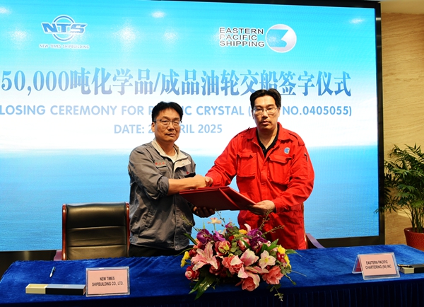 On April 25, 2025, the closing ceremony for 55# 50,000 DWT Chemical/Product Oil Tanker bearing builder's hull no.0405055 was held at the meeting room on 8th floor of New Times Office Building. Our Executive Deputy General Manager Mr. Zhang Yuyong and owner's representatives Mr. Manoj Wadhwani and Mr. Ni Jie were present. The vessel was smoothly and successfully delivered by us and accepted by the Owner.